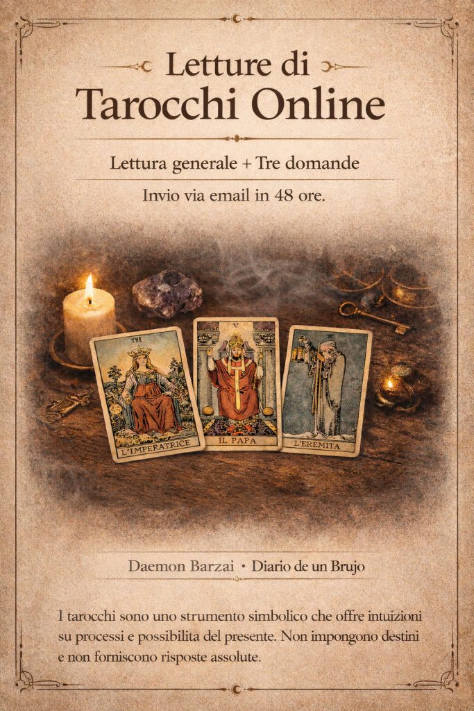 Le mie letture non affrontano temi legati alla salute né sostituiscono alcun tipo di consulenza professionale. I tarocchi vengono utilizzati qui come strumento di riflessione, orientamento e analisi simbolica, non come un oracolo infallibile né come una promessa di certezze assolute.