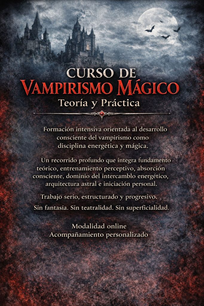 Este curso intensivo de tres meses está diseñado para quienes desean comprender y trabajar el vampirismo desde una perspectiva seria y operativa, integrando teoría sólida y práctica rigurosa. No se trata de adoptar un personaje, sino de desarrollar habilidades concretas: percepción energética, absorción consciente, gestión del intercambio, dominio de la presencia, arquitectura astral y construcción deliberada del Yo Vampírico.